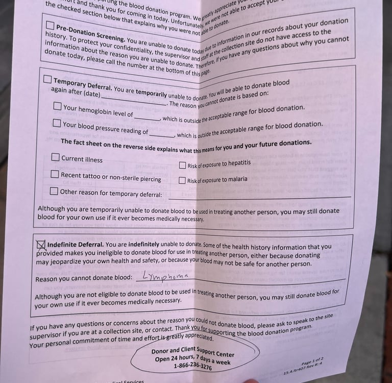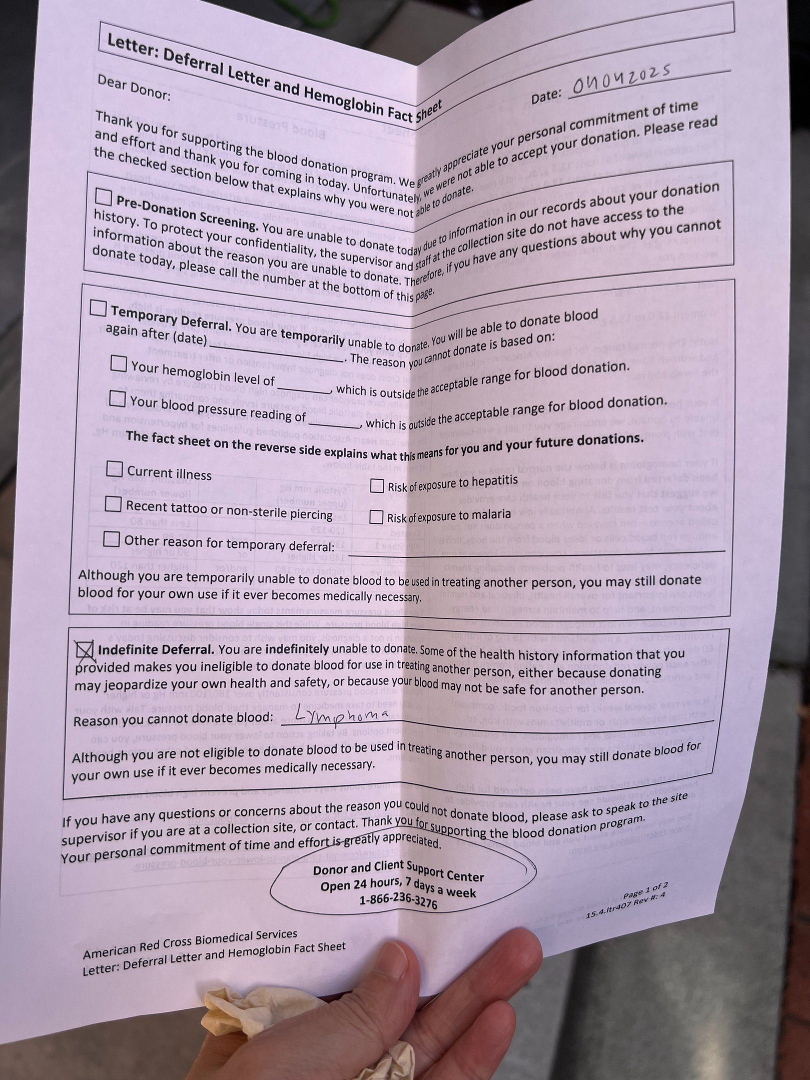 But when I got to the donation center, I was pulled aside, and handed a note—I am permanently ineligible to donate—because of a rare form of lymphoma I had 20 years ago.
