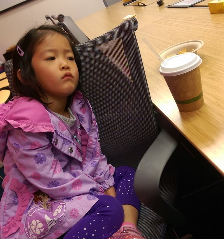 This was ten years ago. My older daughter wasn’t feeling well, and I didn’t have a babysitter. With a full day of meetings, I brought her to the office and set her up beside me in a conference room.